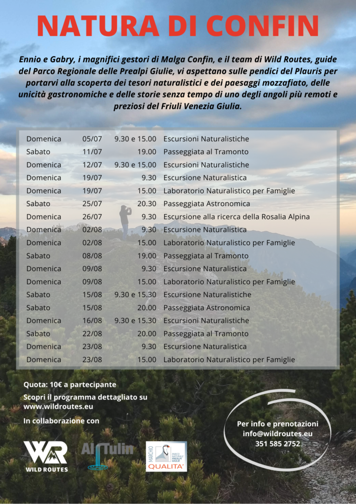 Ennio e Gabry, i magnifici gestori di Malga Confin, e il team di Wild Routes, guide del Parco Regionale delle Prealpi Giulie, vi aspettano sulle pendici del Plauris per portarvi alla scoperta dei tesori naturalistici e dei paesaggi mozzafiato, delle unicità gastronomiche e delle storie senza tempo di uno degli angoli più remoti e preziosi del Friuli Venezia Giulia.