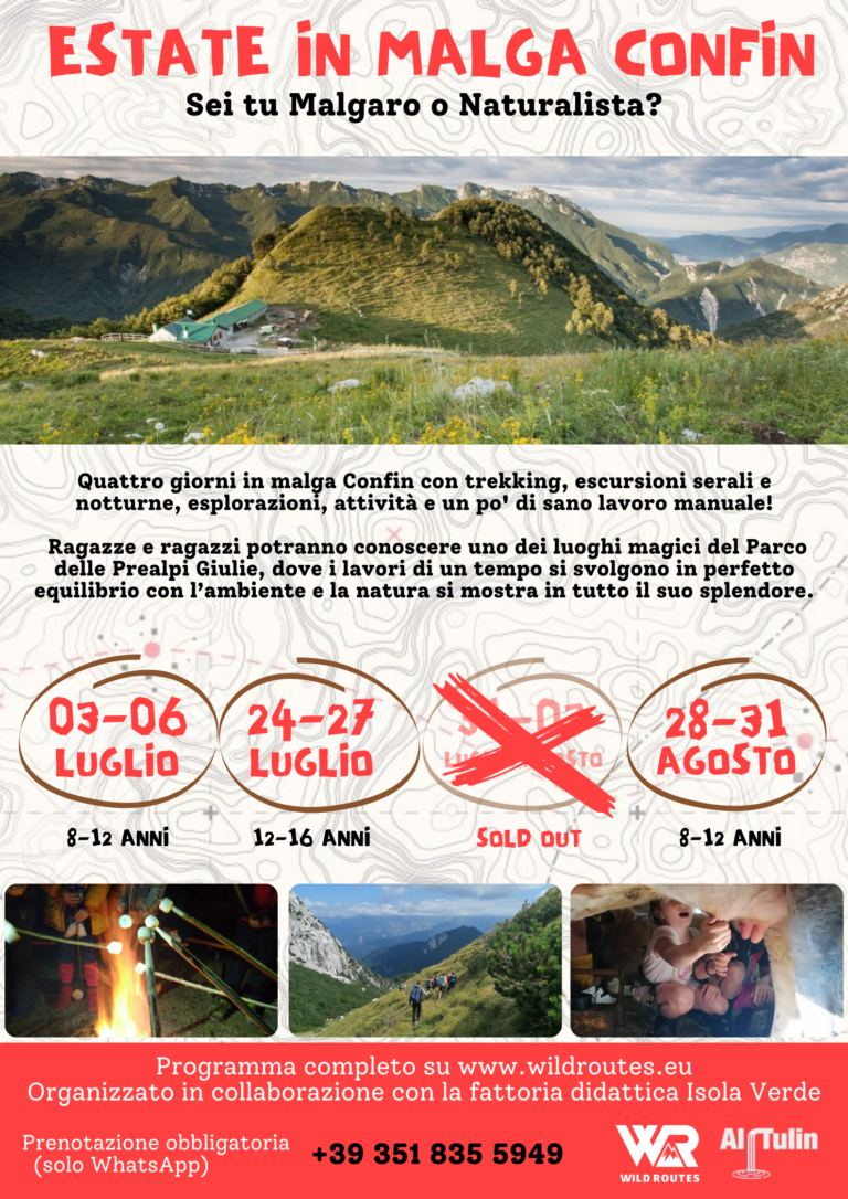 Pensate di inerpicarvi su una meravigliosa strada forestale, che percorrendo la lussureggiante val Venzonassa, si innalza fino alle cime occidentali della cresta dei Monti Musi. Pensate di arrivare alla fine del strada, alla fine del viaggio e di scoprire in realtà di essere all’inizio di una splendida avventura. Con Ennio e Gabry, i magnifici gestori di Malga Confin, assieme a noi guide di Wild Routes vi accompagneremo alla scoperta dei tesori naturalistici, dei paesaggi mozzafiato e delle storie senza tempo di uno degli angoli più remoti e preziosi del nostro territorio.