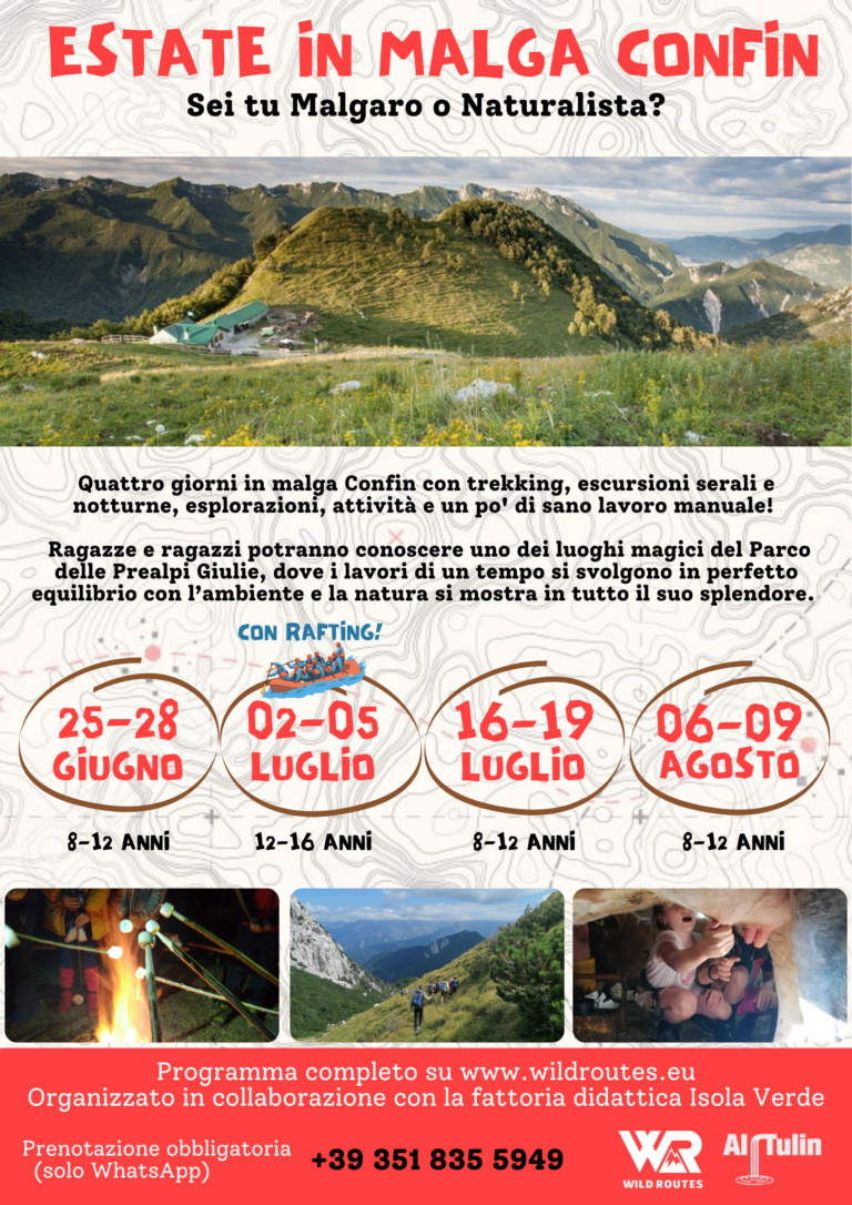 Passando quattro giorni in malga e facendo trekking, escursioni serali e notturne, esplorazioni e attività, i ragazzi potranno conoscere uno dei luoghi magici del Parco delle Prealpi Giulie, dove i lavori di un tempo si svolgono in perfetto equilibrio con l’ambiente e natura si mostra in tutto il loro splendore appena si supera la soglia della malga.